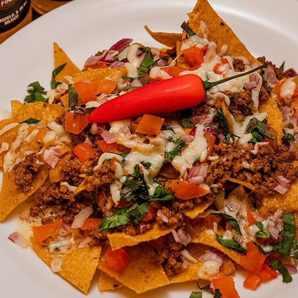 (Prato para finalizar em casa) Tortilla Chips Caseira Com Chili Com Carne, Tomate, Cebola Roxa , Coentro E Queijo Mussarela.