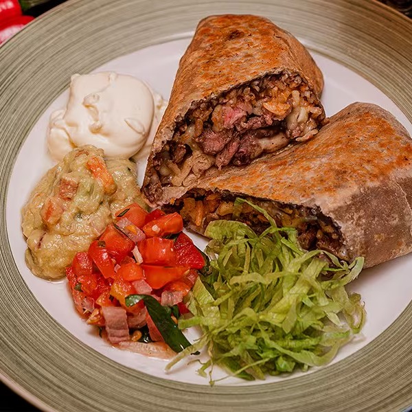 Burrito Recheado Com Frango Ou Carne Temperado Com Chipotle, Frijoles Refritos, Arroz Mexicano, Queijo Mussarela.