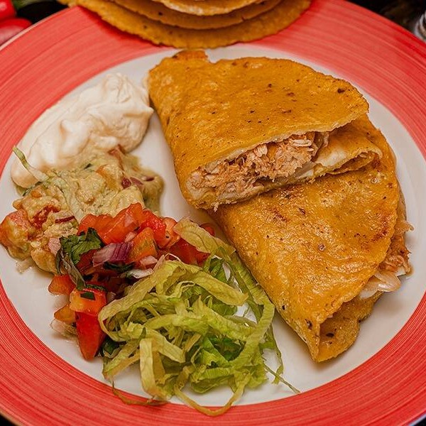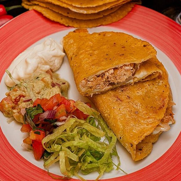 Quesadilla de pollo: tortilla caseira de milho recheada com frango, acompanha guacamole, salsa boracha, alface americama e creme
