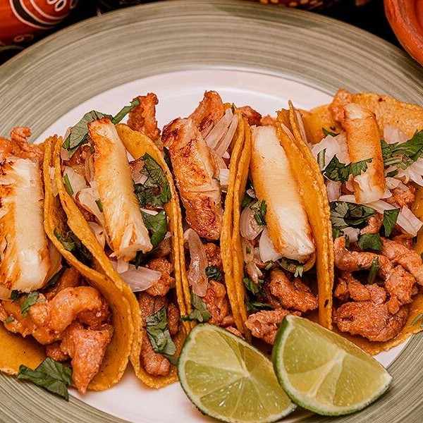 Tacos Al Pastor: 5 tortillas caseiras de milho, copa lombo marinado, abacaxi e cebolas asadas, cebola e coentro, acompanha 3 salsas