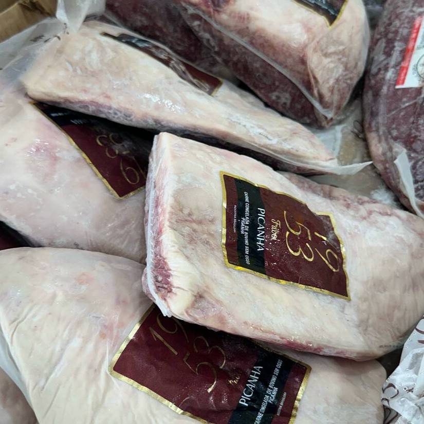 Picanha de bovino da raça Nelore tipo Premium, estrela do churrasco Brasileiro, fica localizada ao lado do contrafilé (região mais macia do boi), a picanha é parte da alcatra, de onde se retiram também o miolo da alcatra e a maminha. Bastante marmorizada, sua famosa capa de gordura garante sabor acentuado ao corte.