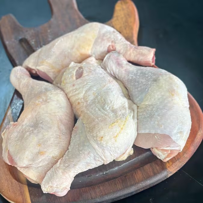 Coxa com sobrecoxa de frango, parte deliciosa do frango, com a carne mais suculenta e saborosa, perfeito para assados em frigideira com legumes ou como preferir.