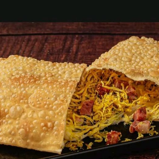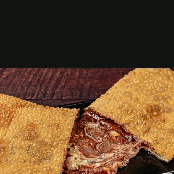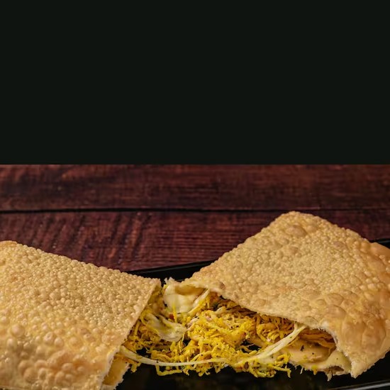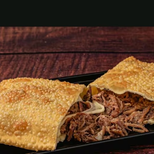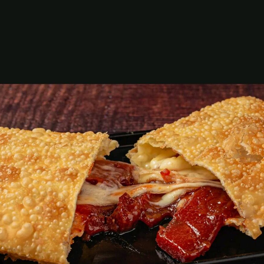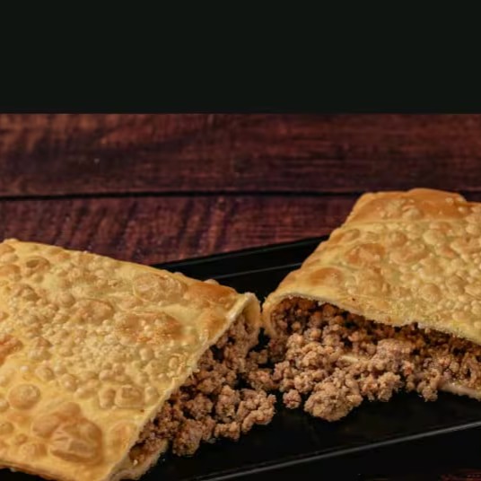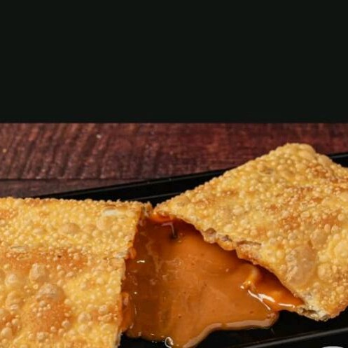 Um pastel recheado de carne moida temperada .envolto em uma Massa crocante e dourada ,perfeito para um lanche sabroso frito na hora .