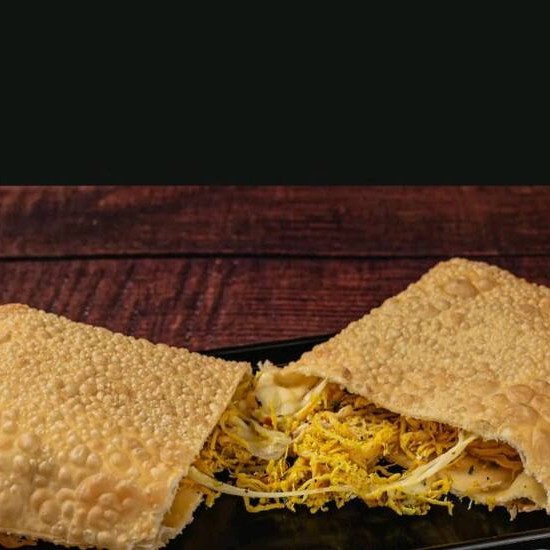 Sabroso pastel Com massa sequinha e crocante e com muito recheio de frango e queijo derretido #Oferta