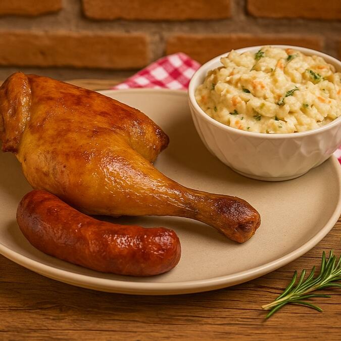 1 coxa sobrecoxa assada, 1 linguiça assada e escolha os acompanhamentos entre ( Arroz, Risoto, Maionese, macarronese, Arroz Carreteiro e Espaguete Alho e Óleo )