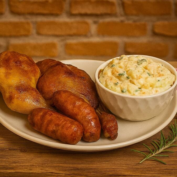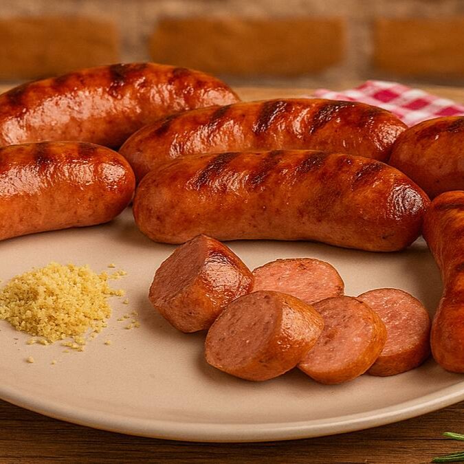 Nossa linguiça assada é preparada no ponto perfeito — suculenta por dentro e dourada por fora.