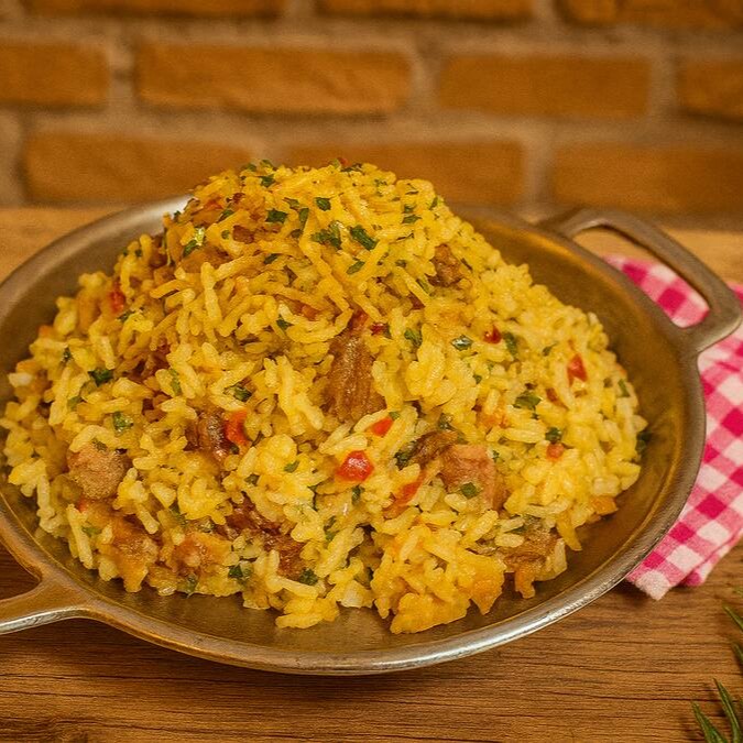 Nosso arroz carreteiro é preparado com carne bovina selecionada e temperos especiais, resultando em um prato suculento, aromático e irresistível.