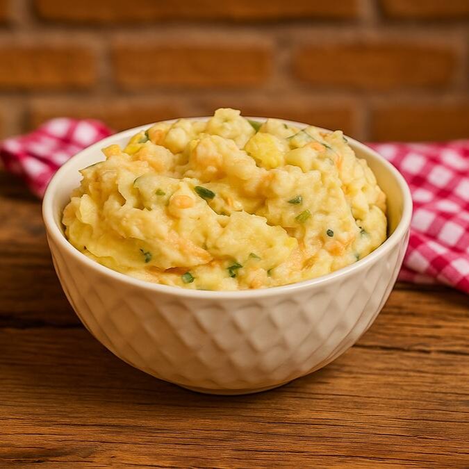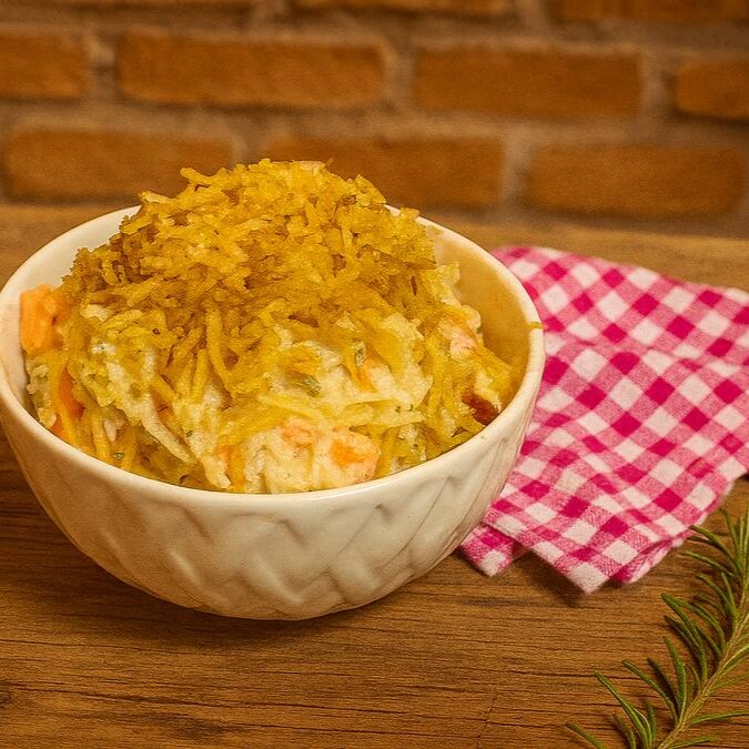 Nossa maionese de batata é cremosa, leve e feita com ingredientes frescos, garantindo sabor equilibrado e irresistível.