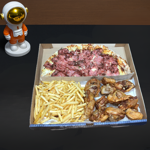 Diretamente do espaço esse é uma caixa de delivery com 1/2 Pizza, 1/4 de Frango a Passarinho e 1/4 de Batatinha Frita. Justamente os 3 mais deliciosos.