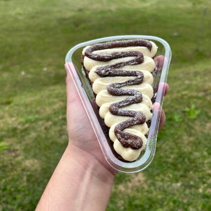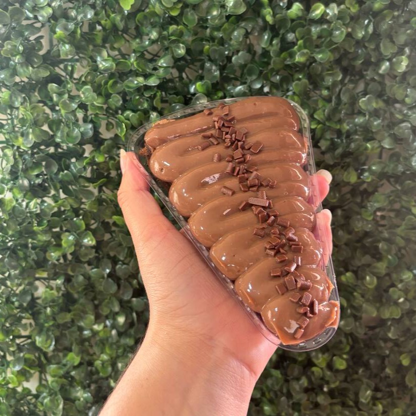 Prepare-se para se apaixonar com a nossa Fatia de Brownie Dois Amores! Uma base de brownie macio e intensamente chocolatudo serve de palco para a combinação perfeita de sabores: uma generosa camada do nosso brigadeiro tradicional encontra a suavidade irresistível do nosso creme de Ninho. Cada mordida é um abraço de doçura e cremosidade, ideal para quem ama a união clássica desses dois queridinhos!