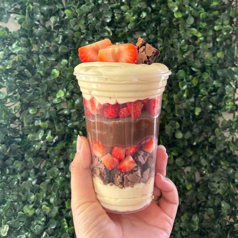 Prepare-se para uma experiência inesquecível! Nosso Copo da Felicidade é uma sobremesa em camadas que combina o melhor de cada ingrediente. Brigadeiro: Uma base aveludada e intensa de chocolate gourmet. Brownie: Pedaços macios e que derretem na boca. Creme de Ninho: A leveza e o sabor inconfundível do leite Ninho em um creme irresistível. Morangos Frescos: A acidez e o frescor das frutas, que equilibram a doçura e tornam cada colherada perfeita.