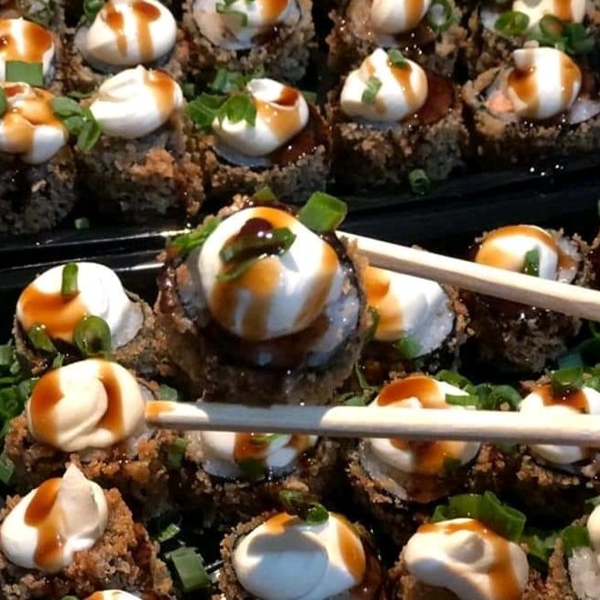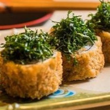 Arroz empanado e frito Salmão em cubos Creme cheese Conve crispy Acompanha molho tarê