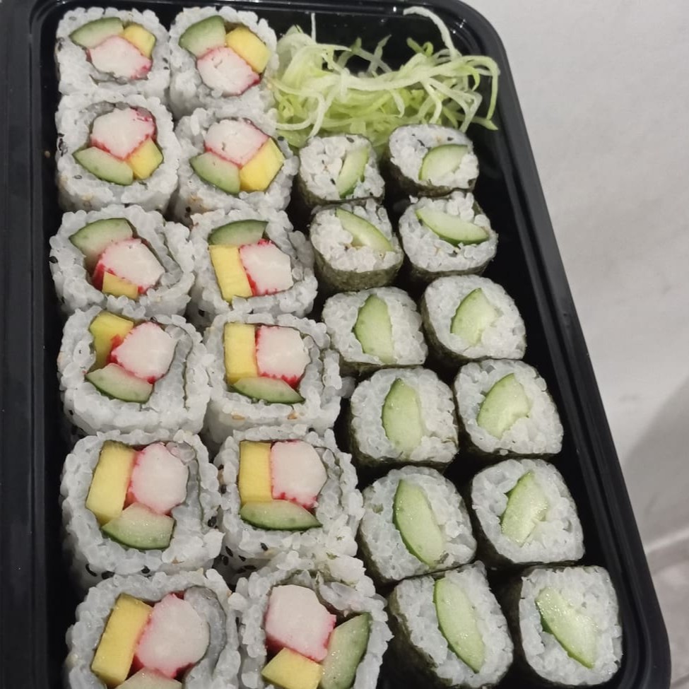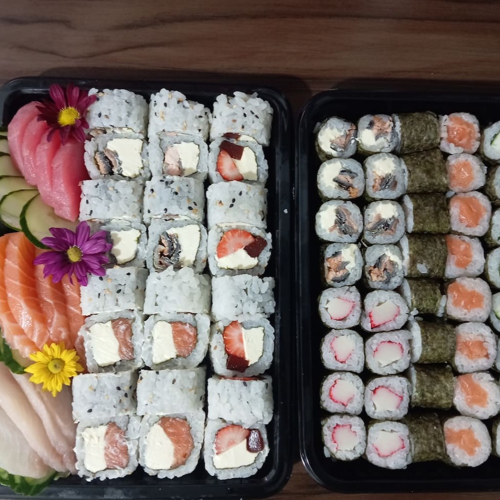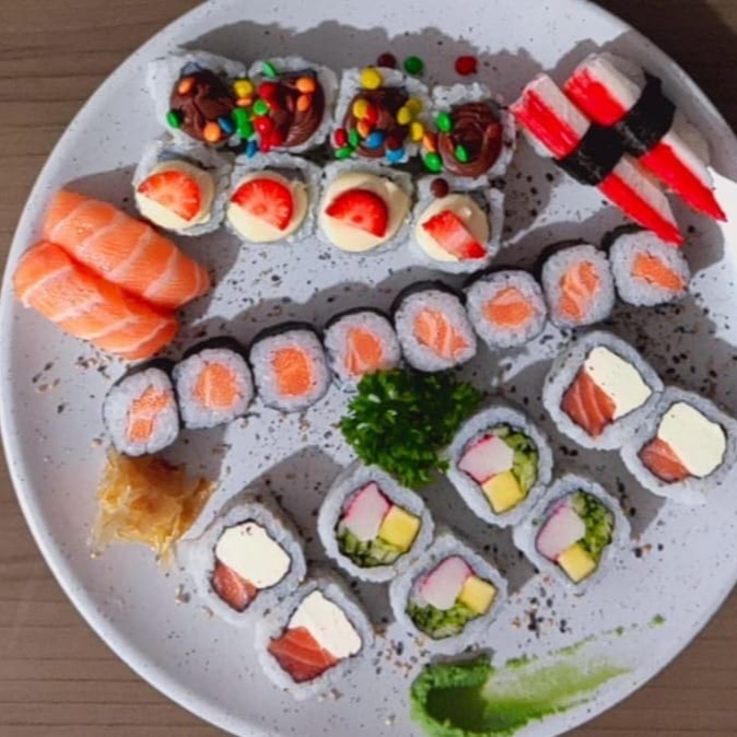 8 hossomaki de salmão 4 uramaki Filadélfia 4 uramaki Califórnia 4 uramaki chocolate branco 4 uramaki chocolate preto 2 Niguiri de salmão 2 Niguiri de kani