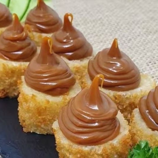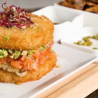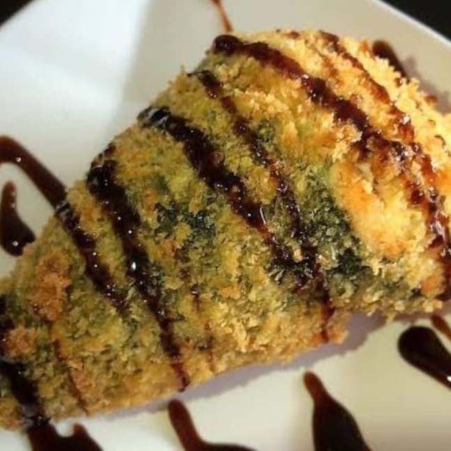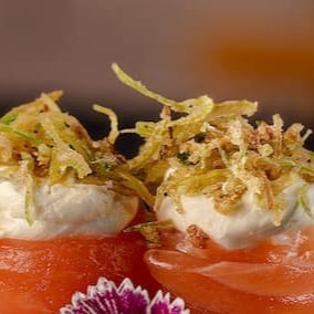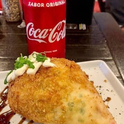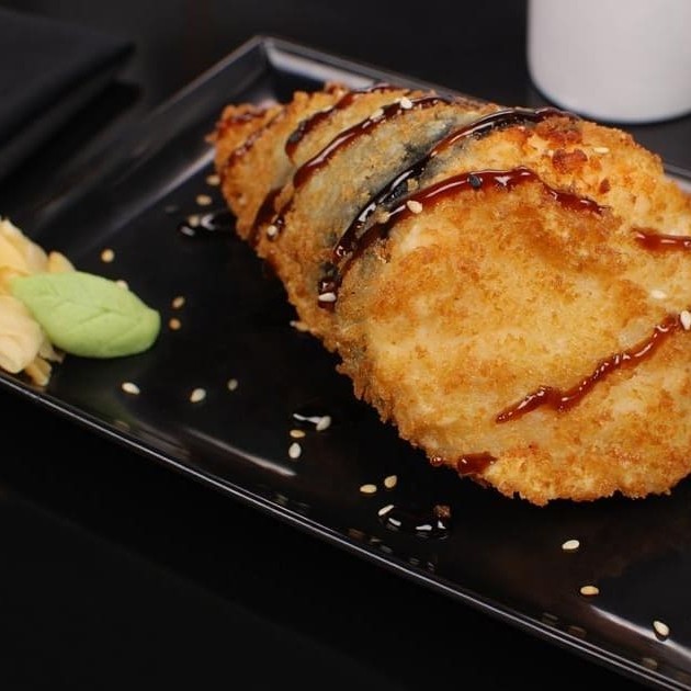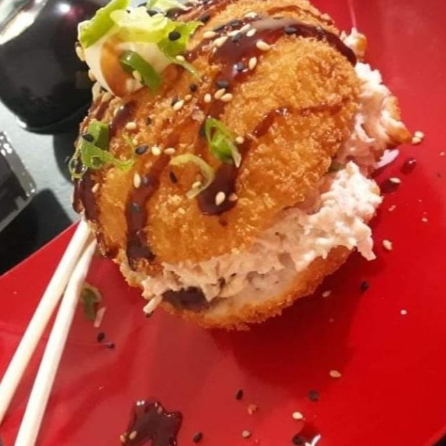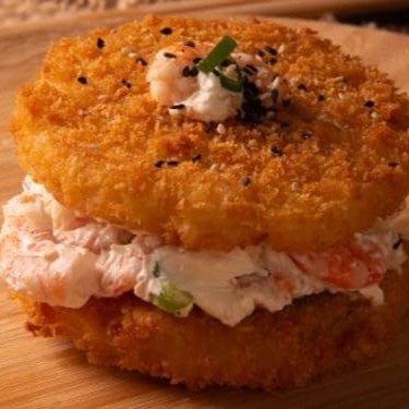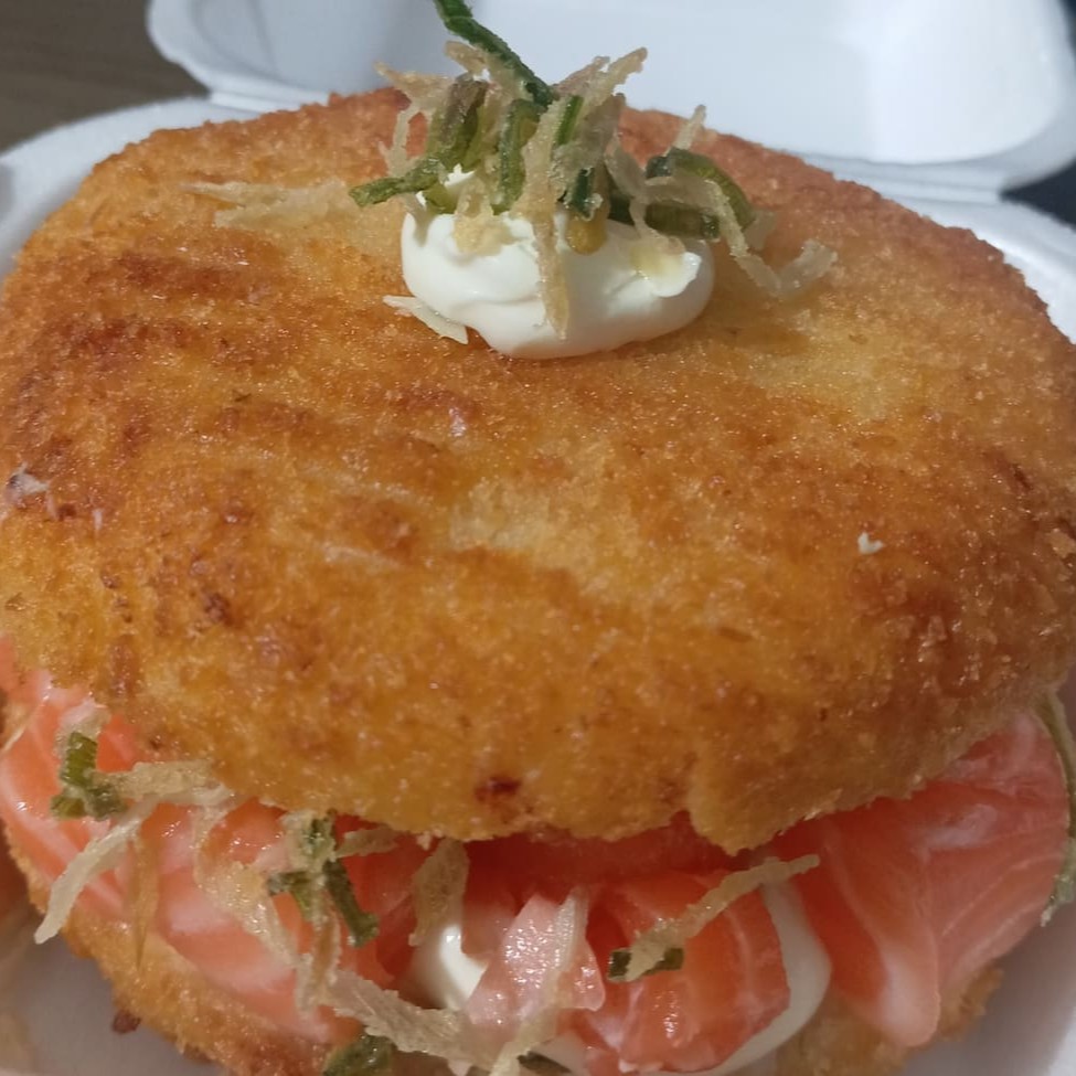 Arroz empanado e frito Recheio cubos de salmão Creme cheese e alho poró