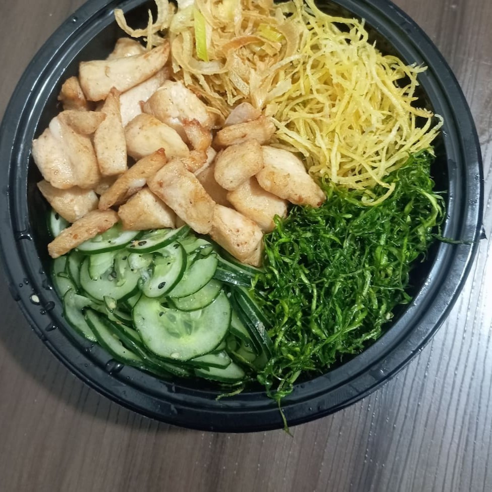 Abase de arroz frango couve alho poró batata doce sunomono molho tare