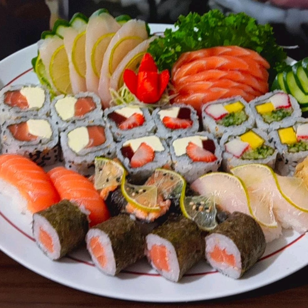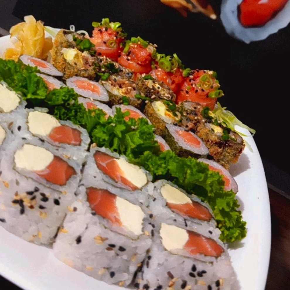 8 sashimi de salmão 8 sashimi de tilápia 8 Joe conve 8 Niguiri skin 8 uramaki kani 8 uramaki Niro 8 Romeu e Julieta 8 uramaki Filadélfia 8 hot Filadélfia