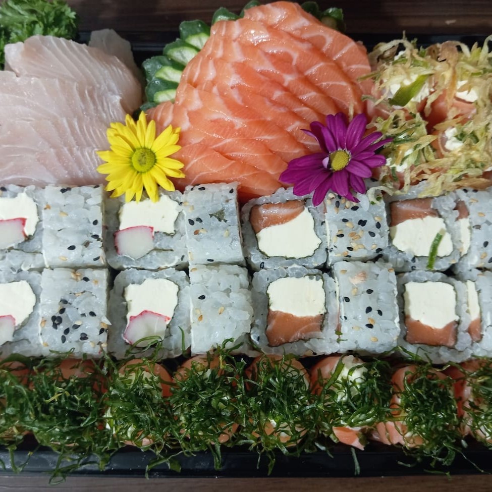 5 sashimi de salmão 5 sashimi de tilápia 4 uramaki Filadélfia 4 Romeu e um 4 Califórnia 4 hosomaki de salmão 2 Niguiri skin 2 Niguiri de tilápia 2 Niguiri salmão
