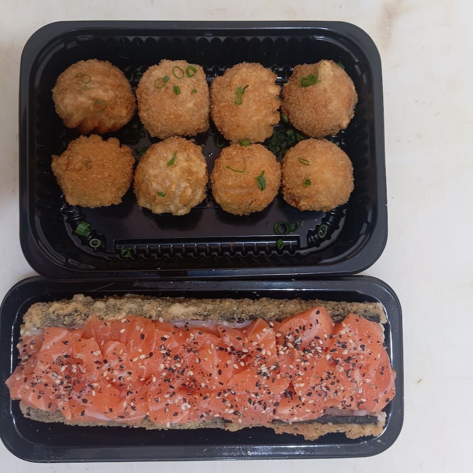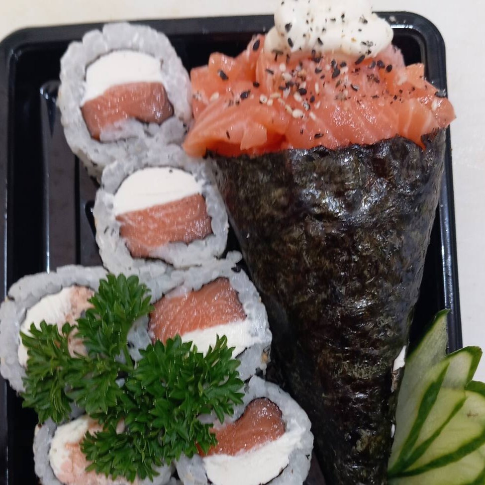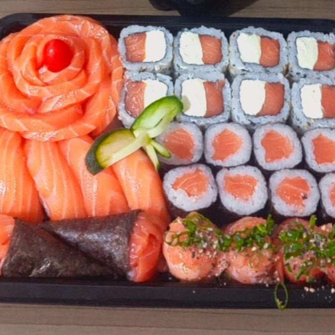 10 sashimi de salmão 8 uramaki Filadélfia 8 hossomaki de salmão 4 Joe 4 Niguiri de salmão 2 Mini temaki de salmão