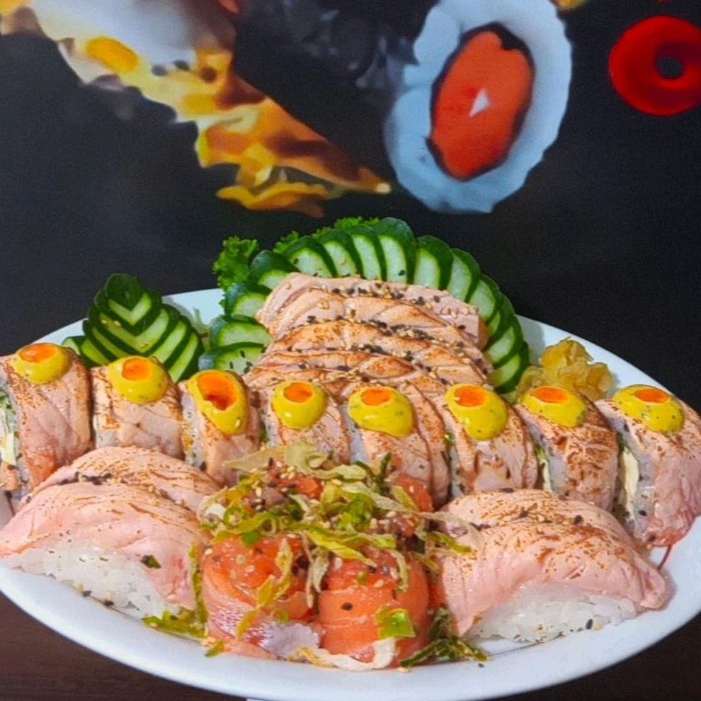 5 sashimi de salmao maçaricado 8 uramaki Filadélfia especial maçaricado 4 Joy alho poró 4 niguiri de salmão maçaricado