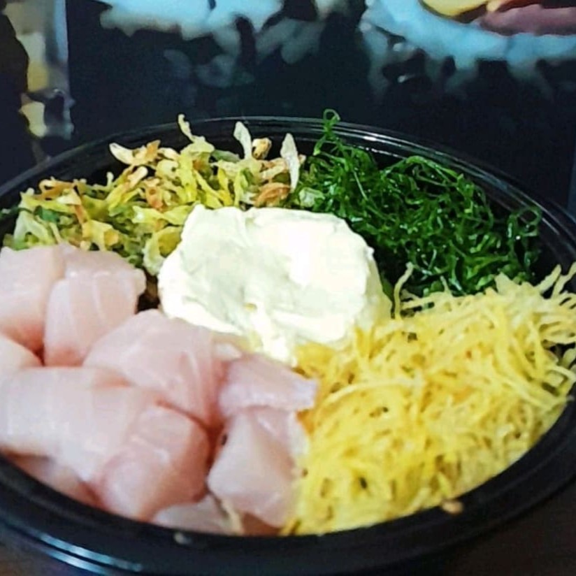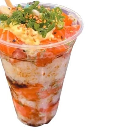 Base:200g de arroz japones. proteina:150g complementos: 5 complemotos. molho: ate um 1 molho gratis. Acompanha: 1 par de hashis (palitinhos)