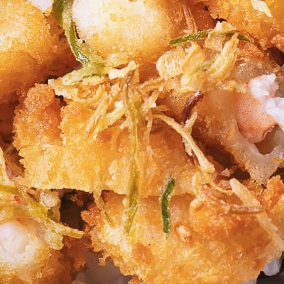 Arroz camarão empanado finalizado com Cebolinha e gergelim
