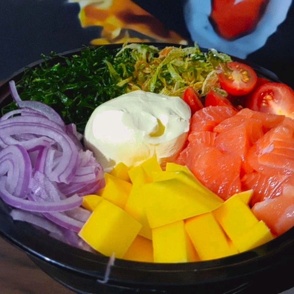 Arroz creme cheese salmão manga cebola roxa alho poró tomate cereja Conve Crispy