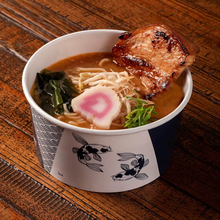 Caldo à base de missô, macarrão Ramen de massa fresca, Chashu (carne suína) e toppings (ovo, narutomaki, cebolinha, broto de feijão e alga wakame).
