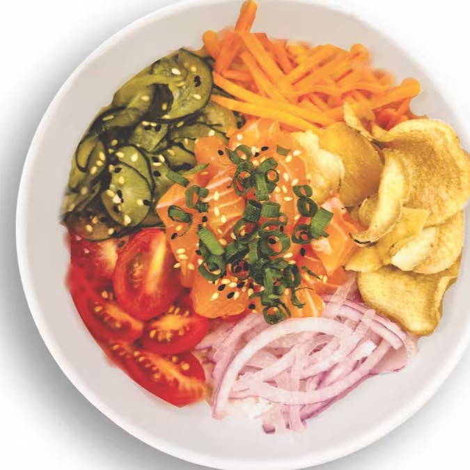 Bowl de Shari 250g - arroz japonês temperado, acompanhado de 60g de salmão fresco, sunomono, cenoura ralada, tomate cereja, cebola roxa, batata doce chips