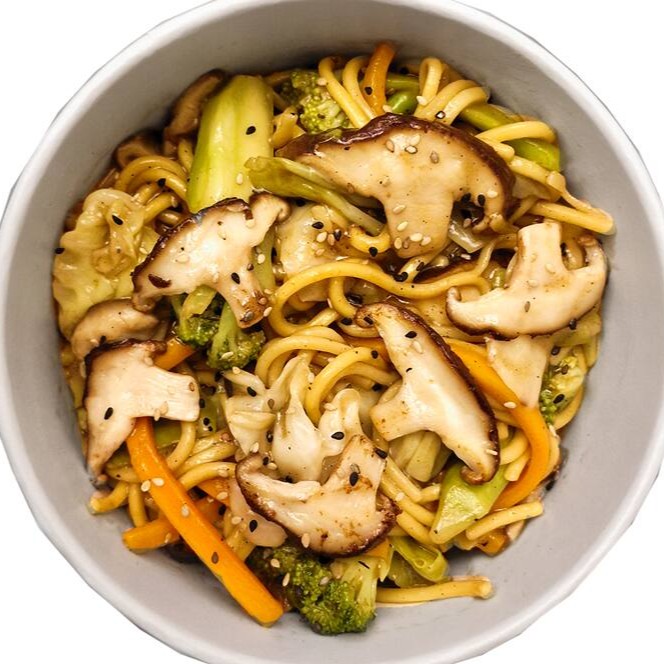 Bowl de macarrão com shitake refogado, repolho, cenoura, brócolis e molho à base de shoyu. Peso total 550g.
