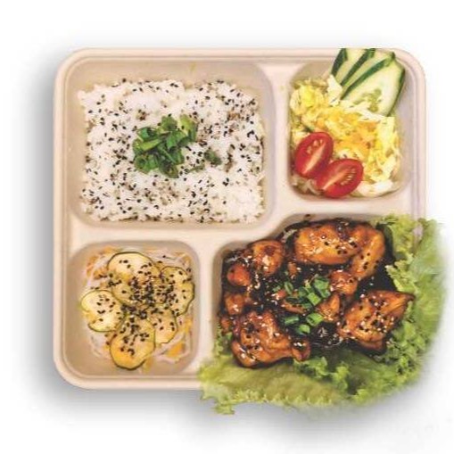 150g Gohan (arroz japonês), 150g de Frango Karaage, salada harusame com sunomono e gergelim torrado, salada fresca (alface, tomate cereja, pepino japonês) com molho japonês da casa.