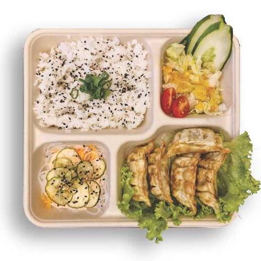 150g Gohan (arroz japonês), 5 unidades de Guiozá Suína, salada harusame com sunomono e gergelim torrado, salada fresca (alface, tomate cereja, pepino japonês) com molho japonês da casa.