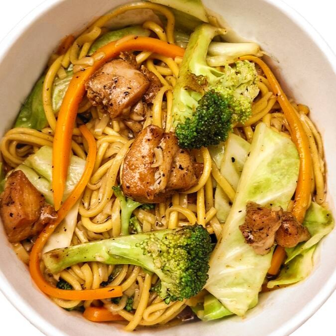 Bowl de macarrão com sobrecoxa de frango, repolho, cenoura, brócolis e molho à base de shoyu. Peso total 550g.