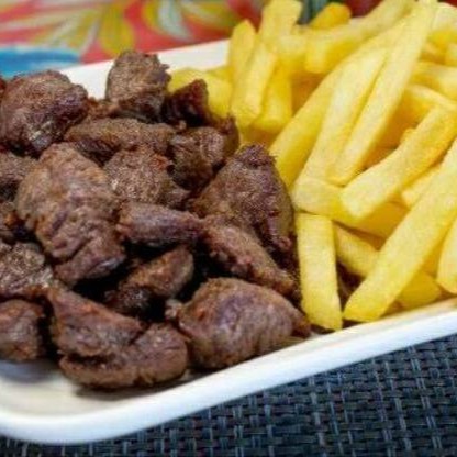Carne de shawarma temperada com especiarias árabe, frita na chapa, acompanha salada, pasta de alho e batata.