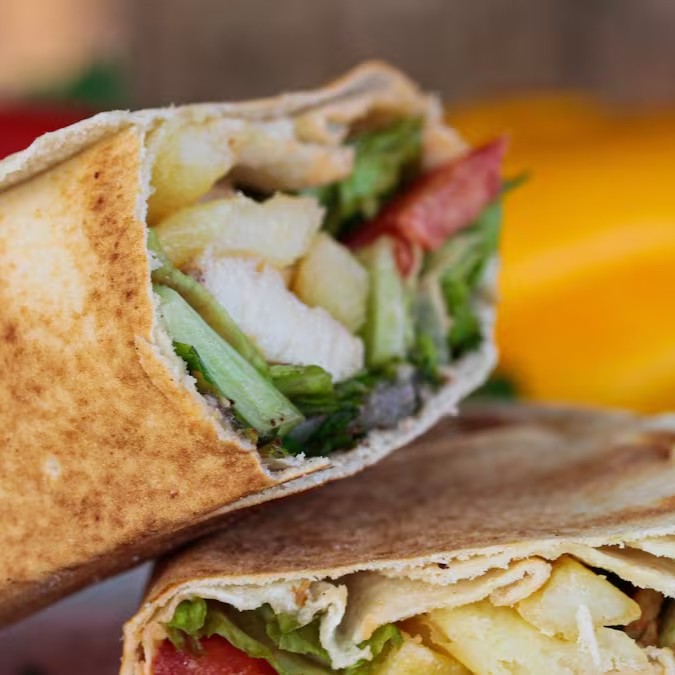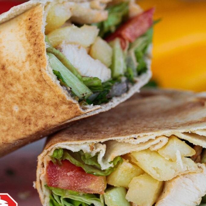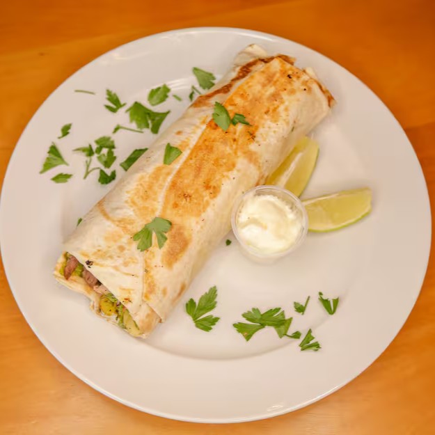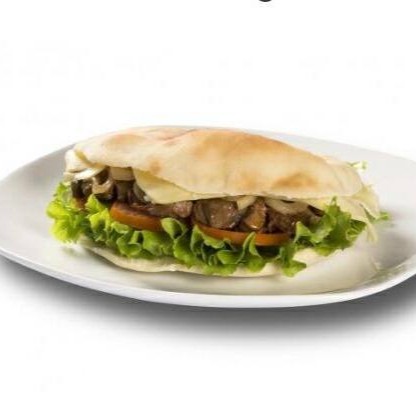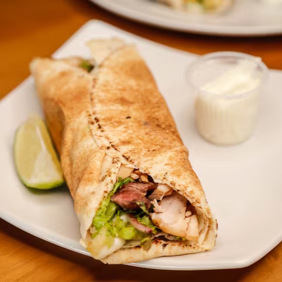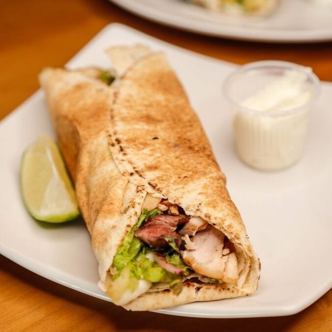 Pão árabe, alcatra, pasta de alho, tomate seco, alface americana e cebola refogada ao shoyo.