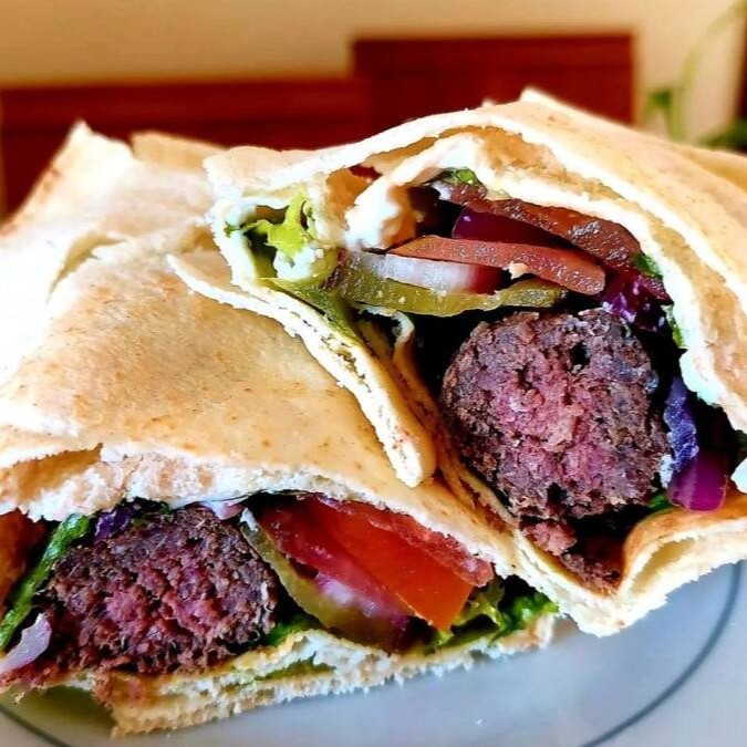 Pão árabe, bolinho de grão de bico, molho de tahine, pepino, tomate, rabanete, salsinha e hortelã.
