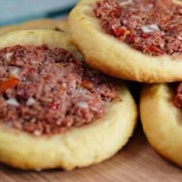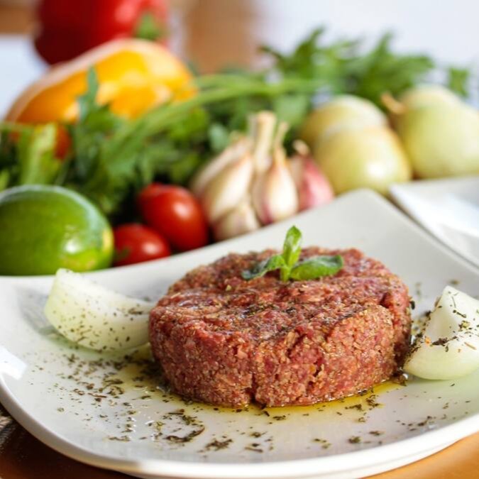 Carne moída, trigo de quibe, especiarias árabes, acompanha pão árabe e creme de alho.