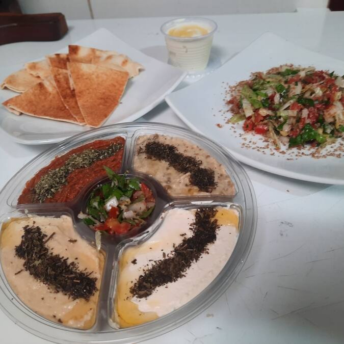 Salada Tabbouleh, hommus, babaganush, coalhada seca, quibe cru, cebola crua e pão árabe.