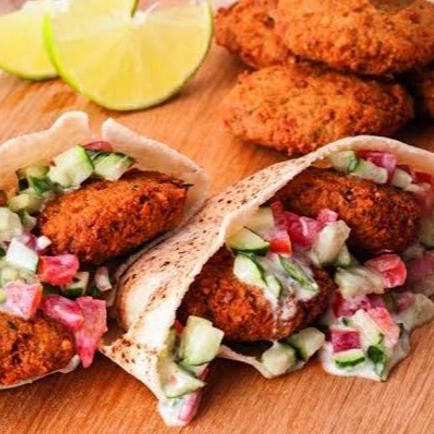 Em pote separado: bolinhos de falafel, salada tabouleh e pão árabe.