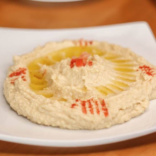 Pasta de grão de bico, temperada com alho, limão e tahine, acompanha pão árabe.