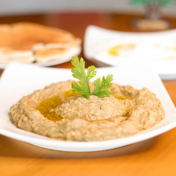 Pasta de berinjela temperada com tahine, alho e limão, acompanha pão árabe.