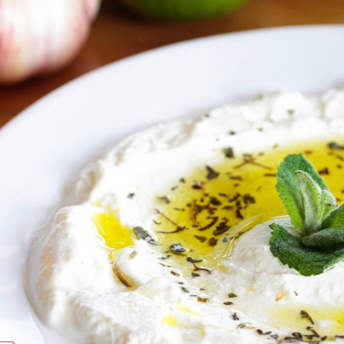 Na bandeja: hommus, babaganush, coalhada seca e pasta de alho.