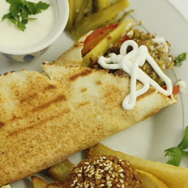 Shawarma de falafel , alface,tomate, cebola, batata frita , picles e molho de alho
