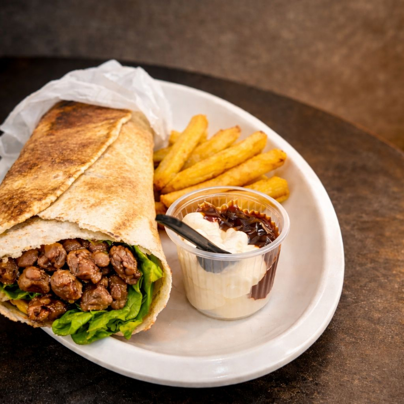 Sawarma de carne e frango, alface,tomate, batata frita,cebola,picles e molho de alho