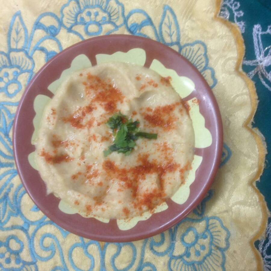 Pasta de grão bico com molho de gergelim ( tahine ) com tempero especial .
