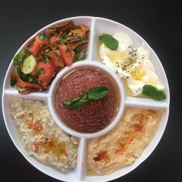 Kibe cru + homus + babaganuch + coalhada seca + pão e salada
