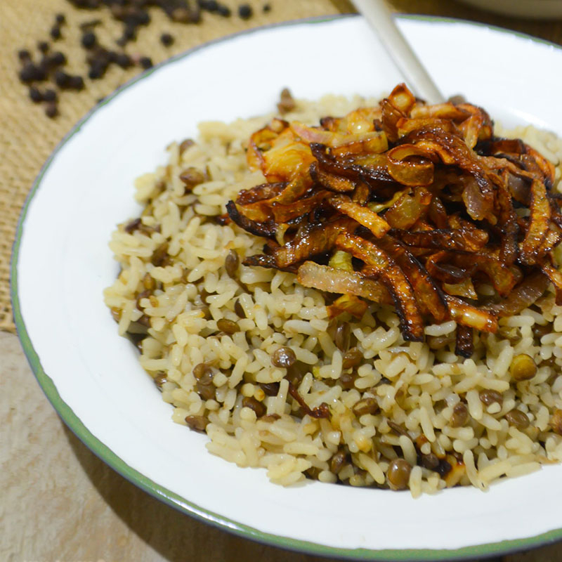 Delicioso prato Vegano Arroz com lentilha acompanhando cebola dorada