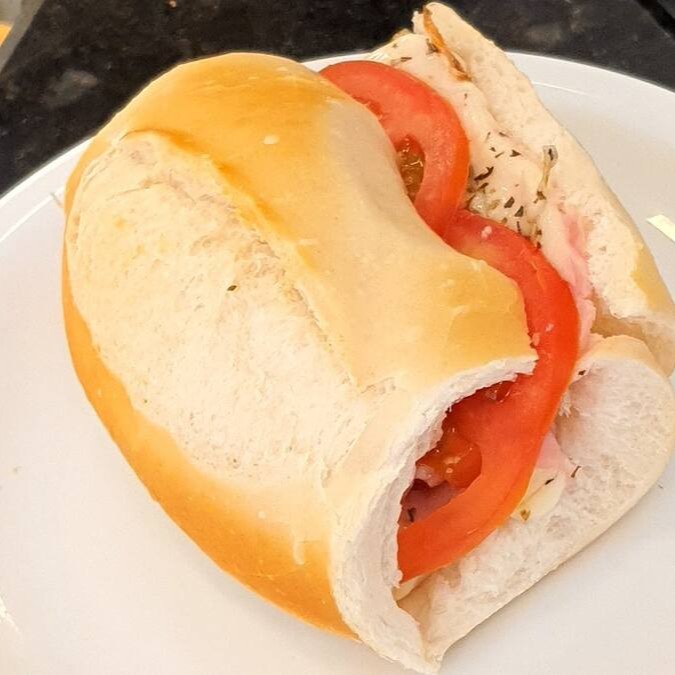 Pão Francês, duas fatias de queijo mussarela, uma fatia de presunto, duas rodelas de tomate e oregano.