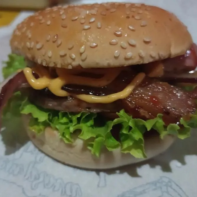 Pão de hambúrguer, maionese, alface, tomate, ovo, calabresa, bacon, presunto, queijo e hambúrguer 90g
