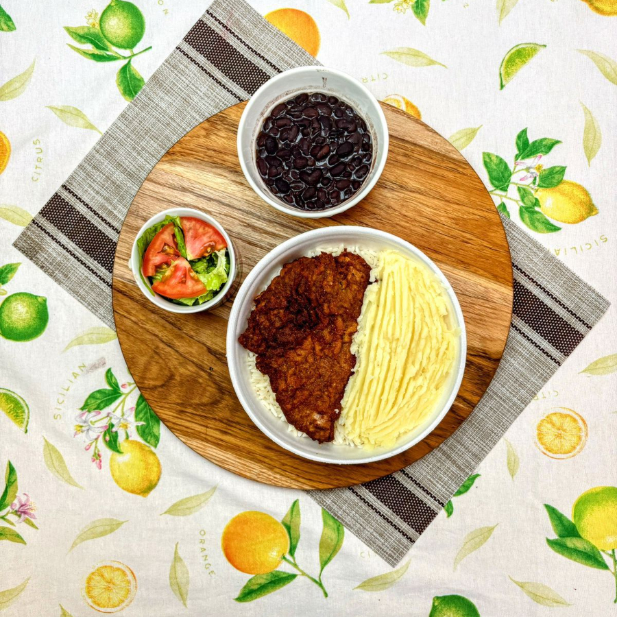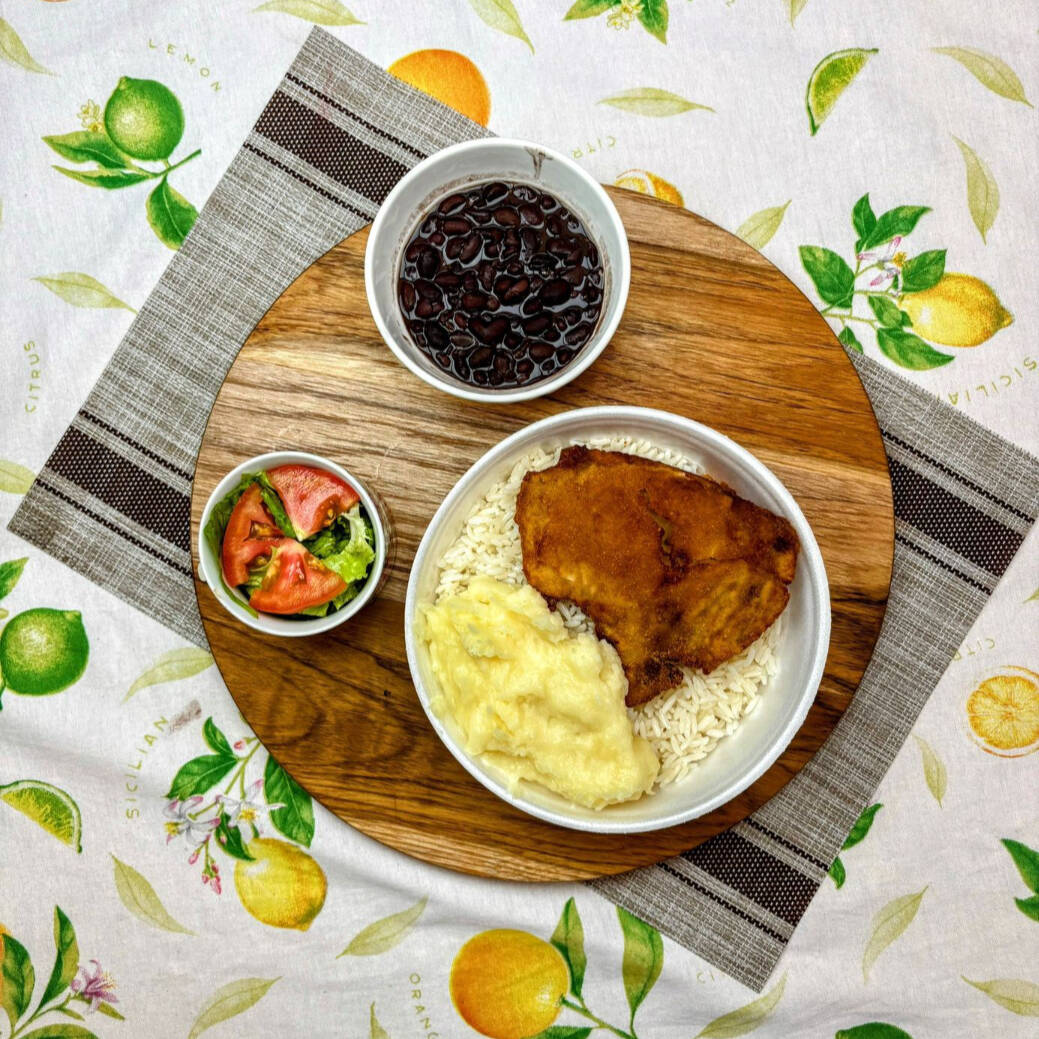Arroz branco soltinho, Feijão (a sua escolha), Purê de batata cremosa, Bisteca Milanesa Crocante + Salada do Dia !!
