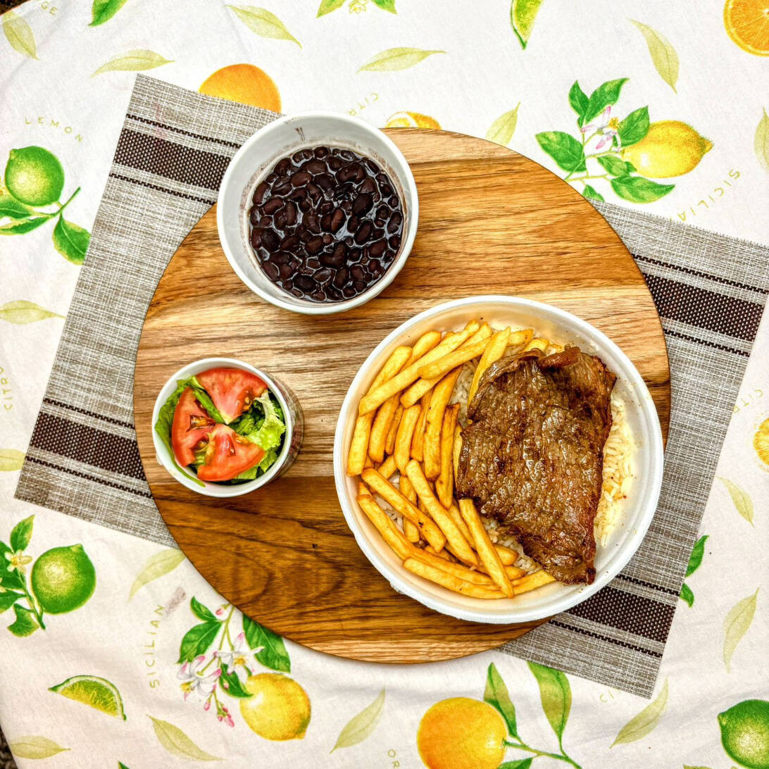 Arroz soltinho, Feijão (a sua escolha), Acompanhamento do dia, Suplementos do dia e Uma Carne Suculenta Para Saborear